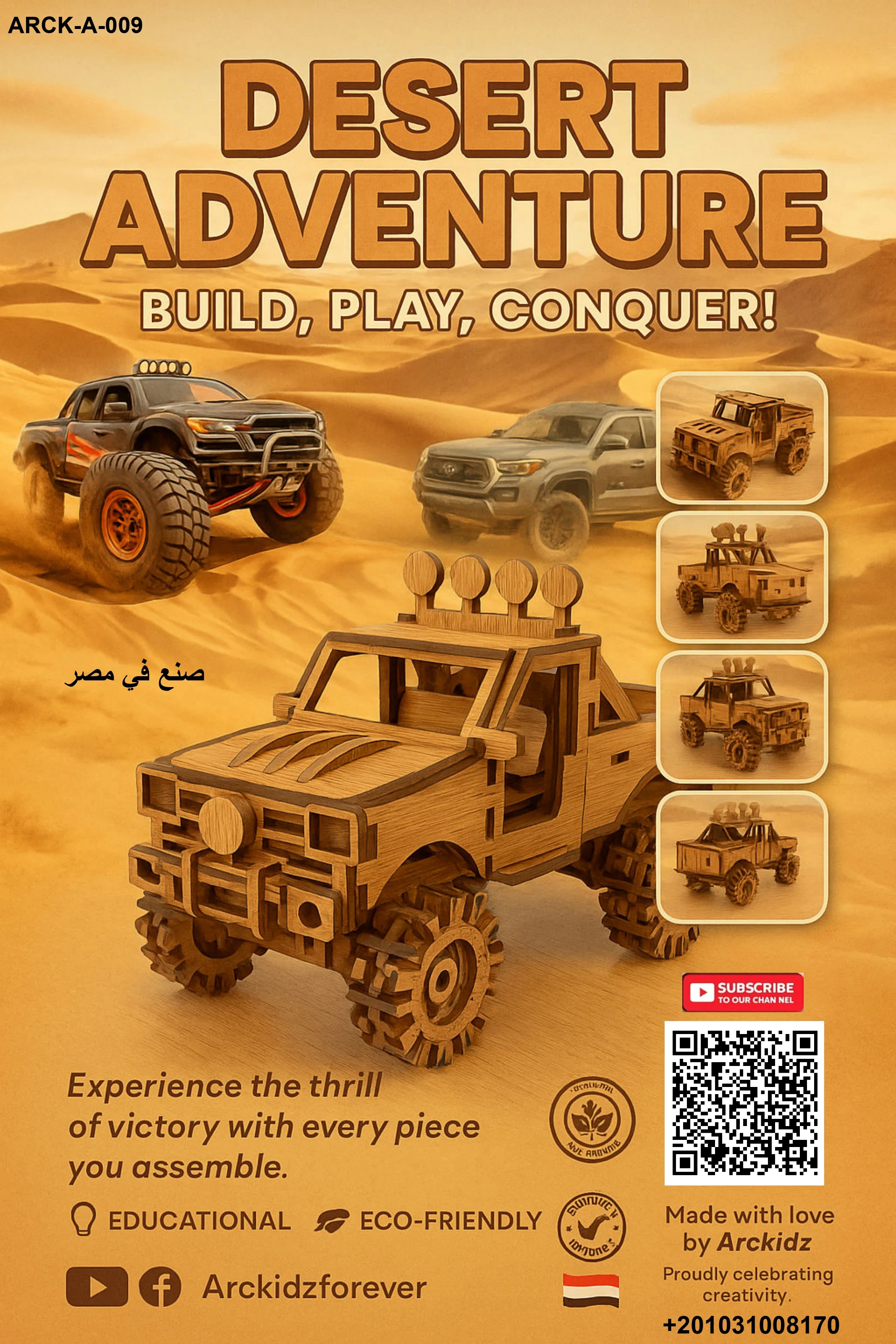 المنتج عبارة عن نموذج سيارة جيب خشبية بتتركب قطعة قطعة لحد ما تتحول لعربية قوية جاهزة لعالم من الخيال والمغامرات.