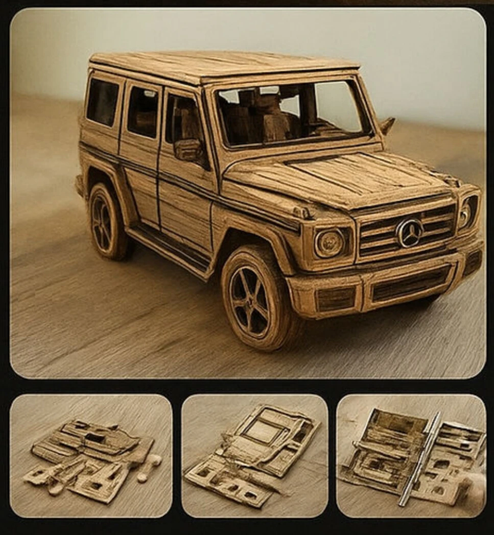 المنتج عبارة عن سيارة جيب خشبية بتتركب قطعة قطعة لحد ما تتحول لنموذج سيارة كامل تقدر تحتفظ بيه أو تهديه.