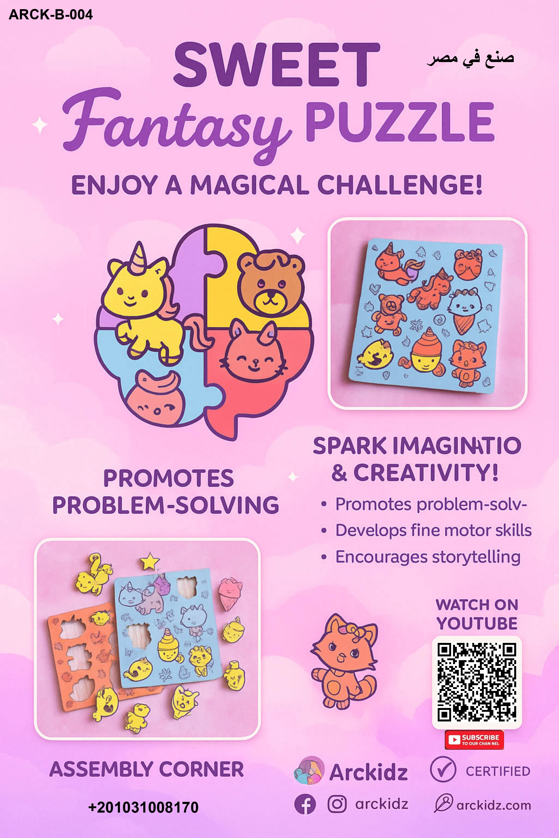 اللعبة عبارة عن بازل خشبي مليان ألوان وأشكال ممتعة مستوحاة من عالم الحلويات والخيال، وبيساعد الطفل على التعلم بطريقة ممتعة.