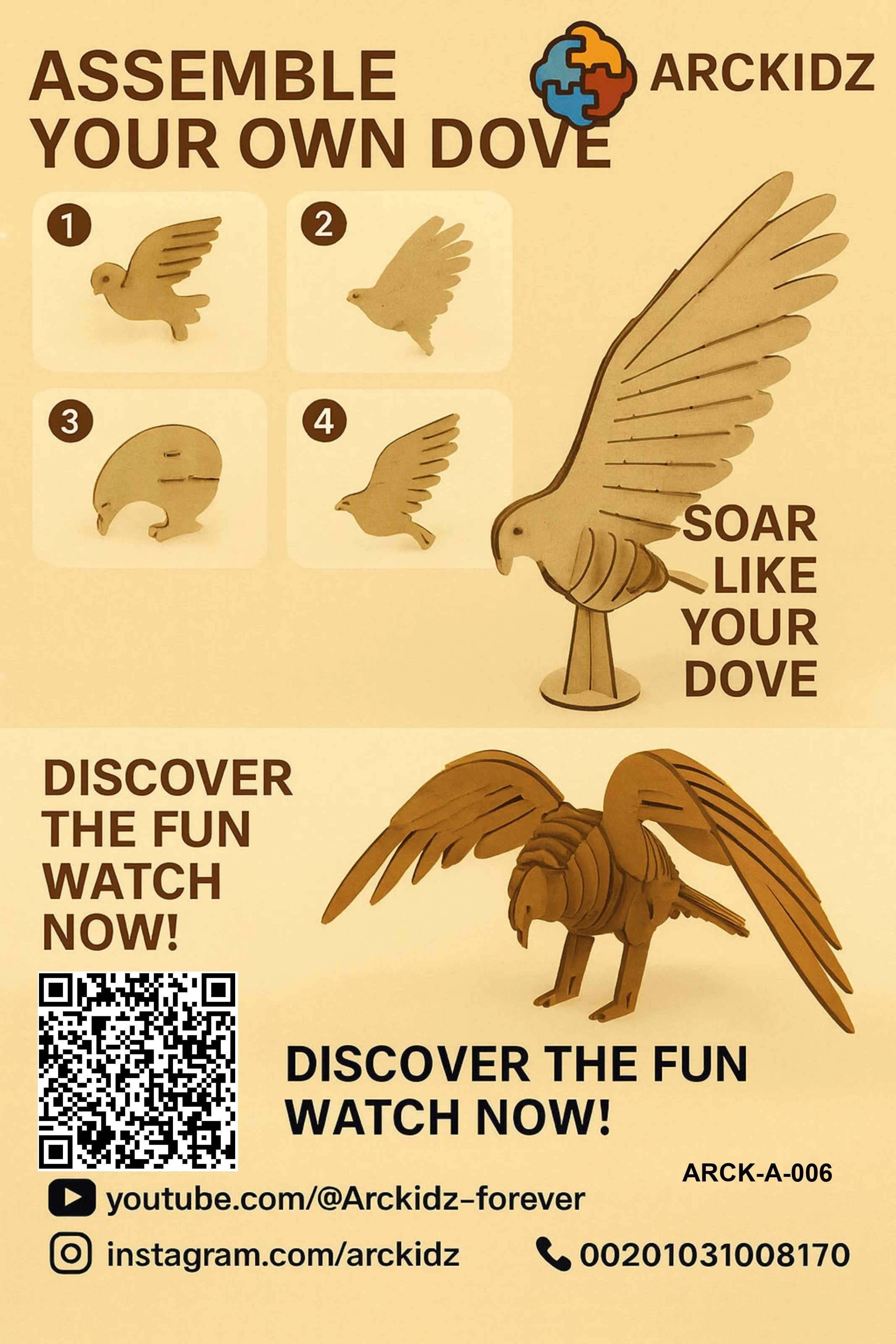 المنتج عبارة عن نموذج حمامة خشبي بيتجمع قطعة قطعة لحد ما يتحول لشكل جميل تقدر تحتفظ بيه أو تهديه.
