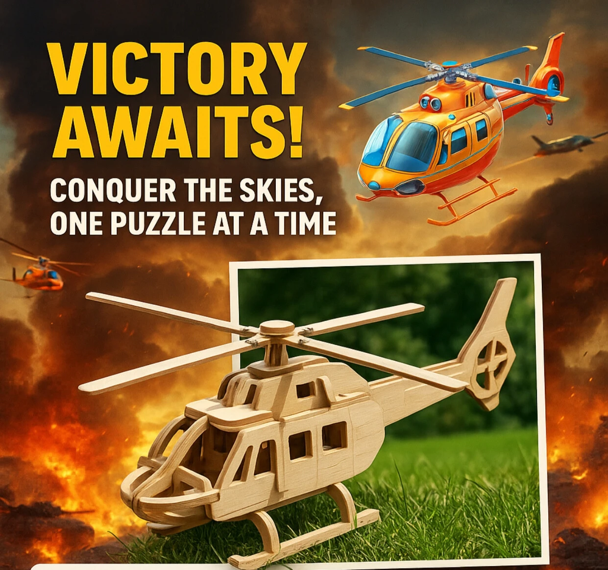 المنتج عبارة عن مروحية خشبية بتتركب قطعة قطعة لحد ما تتحول لنموذج كامل تقدر تحتفظ بيه أو تهديه.